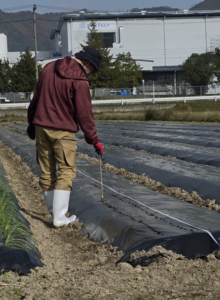 - 定植:開けた穴に、一つひとつ手作業で苗を植えていきます。