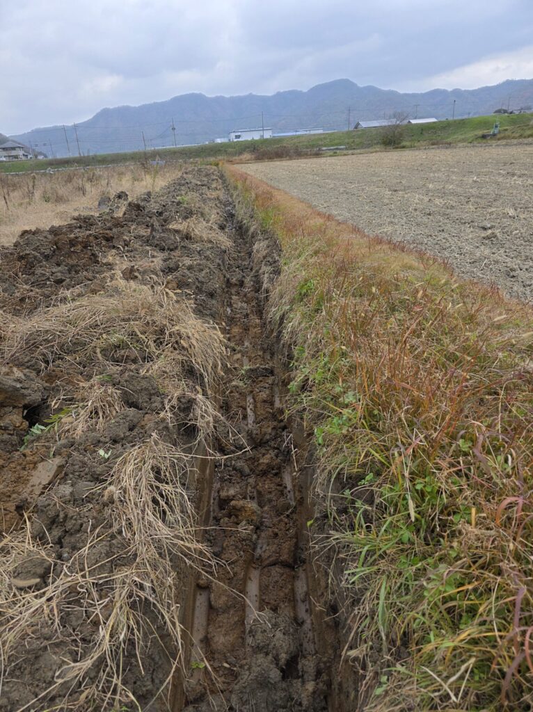 そこで、定期的に深い溝を掘り、余分な水がスムーズに畑の外へ流れ出る「水の通り道」を作ってあげるのです。